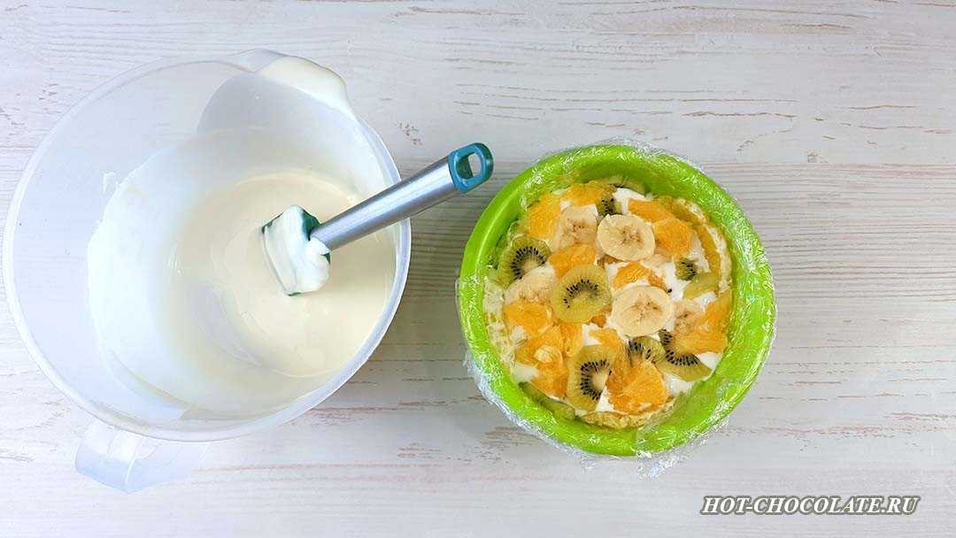 - Ставим десерт в холодильник до полного застывания верхнего слоя.