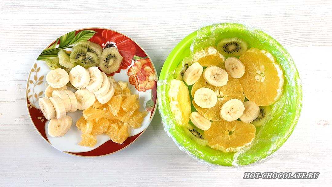 Клубнику вымойте и обсушите, удалите хвостики, а затем порежьте небольшими кусочками произвольной формы. Бананы и киви очистите от кожуры, также нарежьте. С апельсинов снимите шкурку, разделите на дольки, с каждой дольки аккуратно снимите плёнку и удалите косточки.