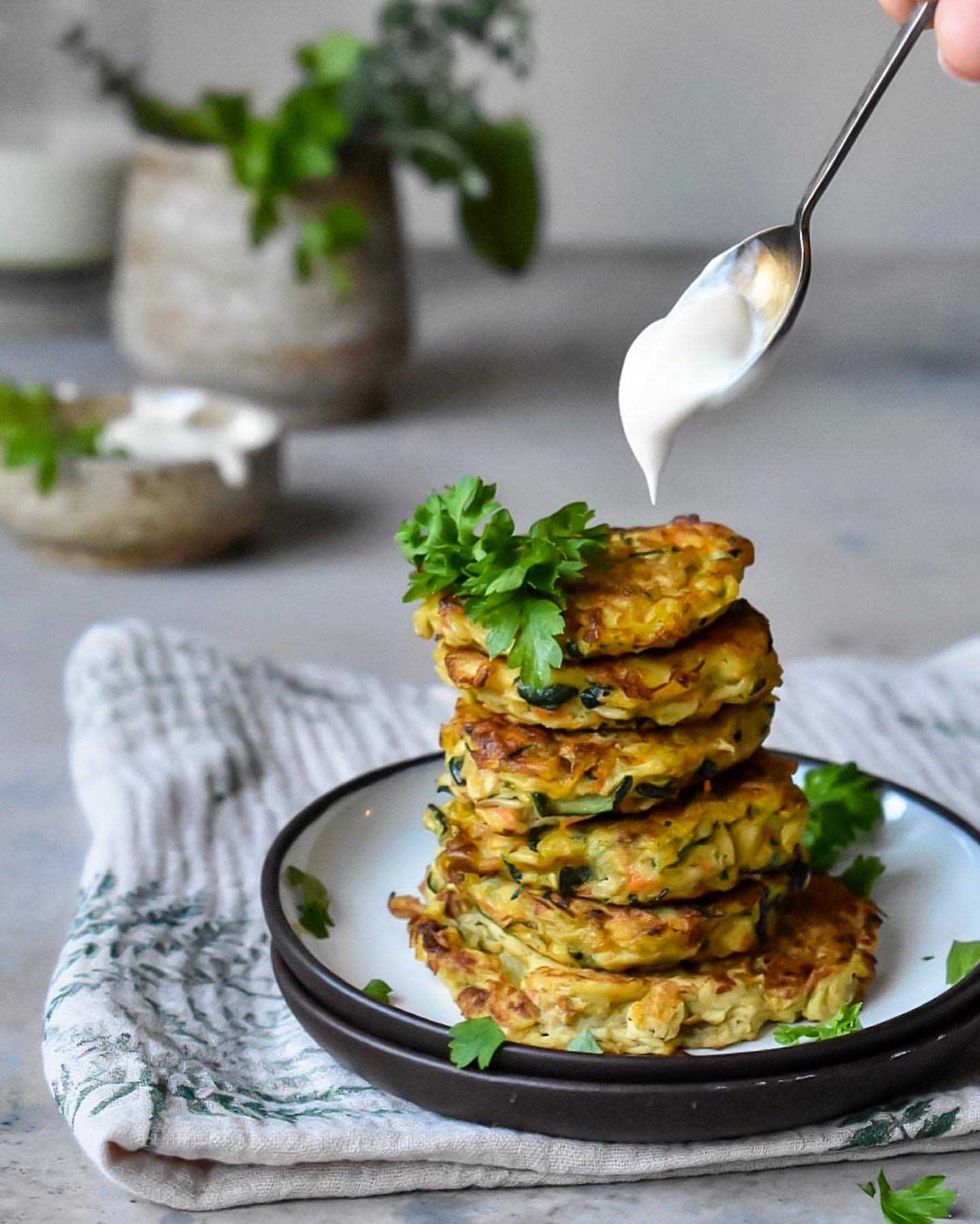 Овощные драники хорошо сочетаются со сметаной. В соус можно добавлять рубленую зелень.