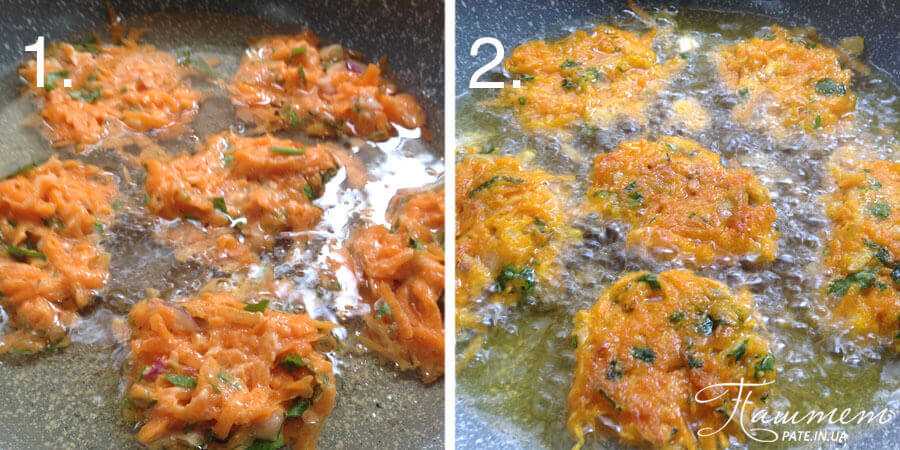 - В сковороду налить масло, хорошо разогреть ее. Лучше использовать сковороду с противопригарным покрытием, тогда масла понадобится совсем немного. Овощную массу выкладывать небольшими лепешками ложкой.