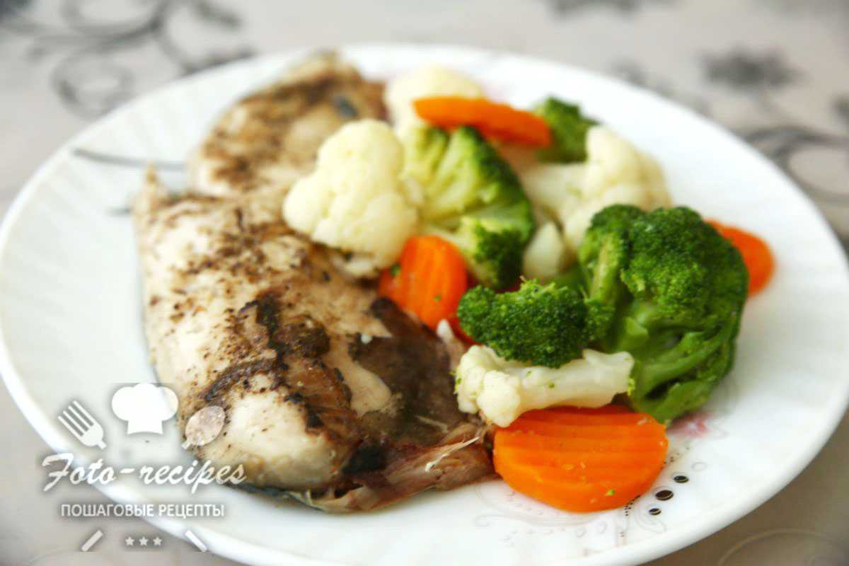 Рыбу приготовьте на пару вместе с овощами: брокколи, цветной капустой и морковью. Приправьте солью и свежей зеленью.