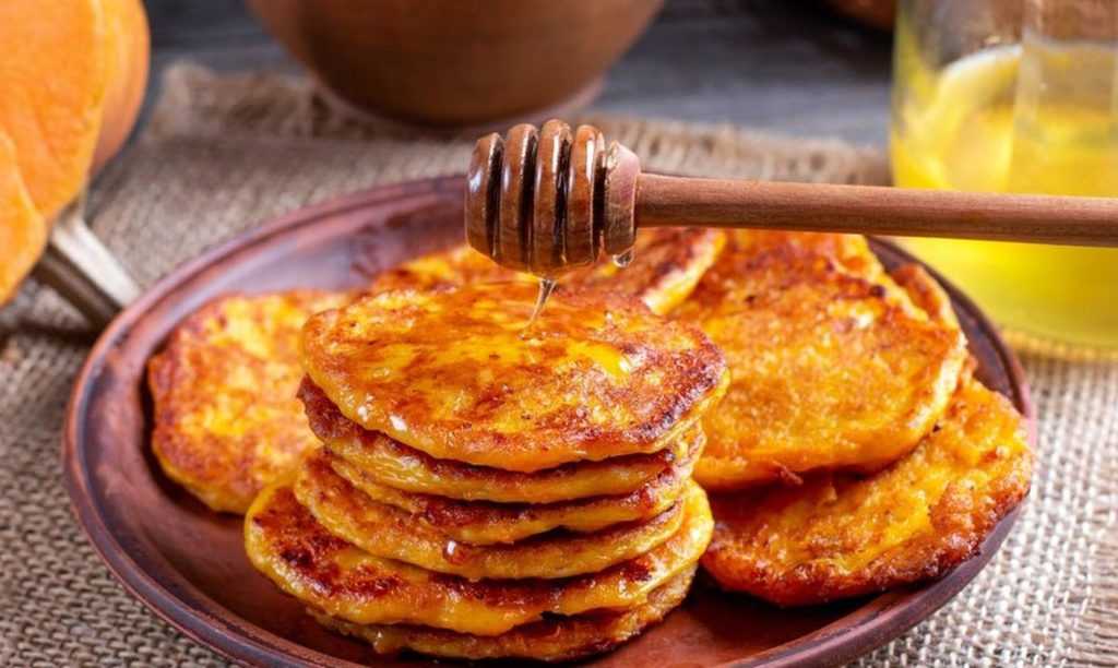Оладьи из сырой тыквы подходят для детского и диетического меню. Если исключить из блюда яйца и сметану, оно придётся по вкусу и вегетарианцам.