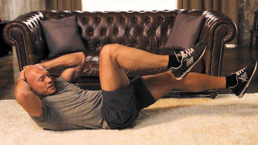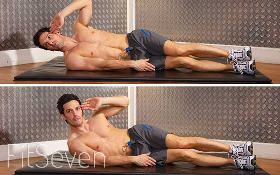 Лежа на спине, согните ноги в коленях, руки выпрямите, но не кладите их на пол. Приподнимите корпус и сделайте наклон влево, ощущая работу косых мышц. Сразу же выполните такой же наклон вправо. Одно из основных упражнений из тренировки на косые мышцы живота интенсивно прорабатывает боковую мускулатуру корпуса.