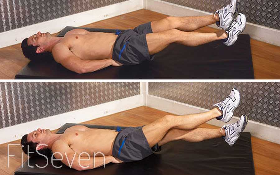 На выходе, напрягая мышцы пресса, направьте колени к груди, стараясь слегка оторвать нижнюю часть спины от пола. На вдохе медленно опустите ноги вниз, однако не ставьте их на пол. Поддерживайте осознанное напряжение в мышцах пресса 10-20 сек, затем повторите упражнение // 3 подхода по 10-12 повторений