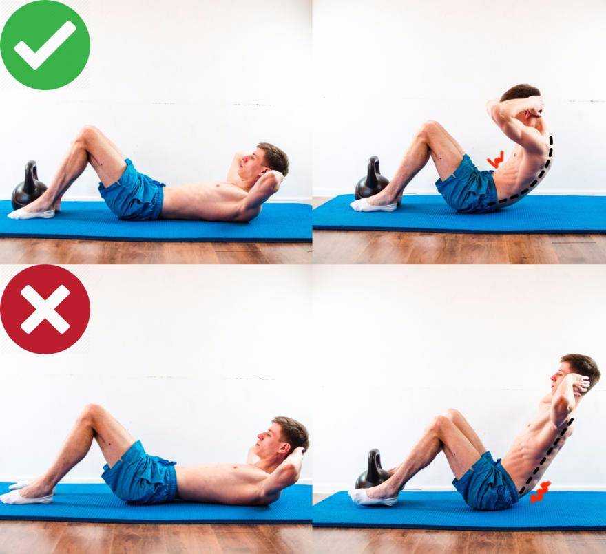 Скручивания – самое эффективное упражнение для пресса с точки зрения физиологии. Ведь основная функция прямой мышцы живота – это скручивать тело человека. Самым простым вариантом для начинающих является скручивание ног к животу. В то время как скручивание туловища к животу значительно сложнее выполнить. Важным моментом является округление спины во время упражнения.