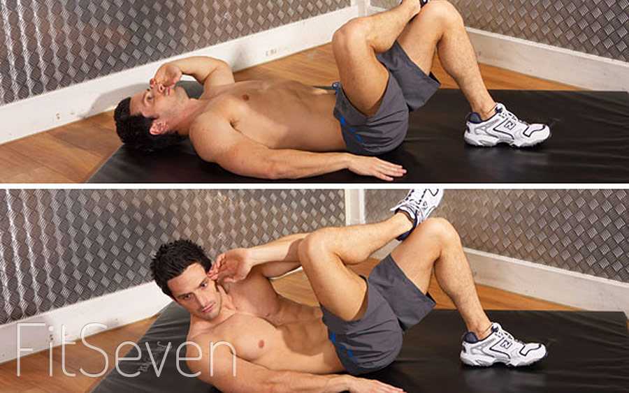 Лягте на спину, стопу левой ноги положите на бедро правой, руки сложите за головой. Поднимите корпус, оторвите от пола лопатки и выполните скручивание влево, стараясь локтем коснуться колена. Выполните то же самое для другой стороны. Базовое упражнение прорабатывает прямую, поперечную и косые мышцы живота, укрепляя пресс.