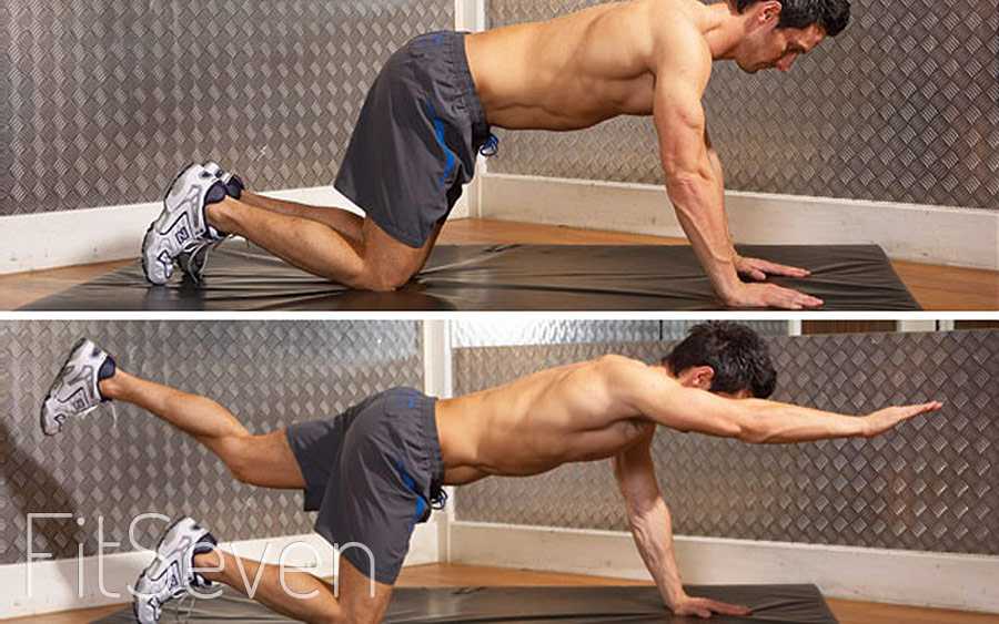 Встаньте на колени, опираясь на руки. На выдохе напрягите пресс и втяните пупок как можно сильнее внутрь, затем вытяните правую руку вперед, а левую ногу — назад. Задержитесь в позиции на 10-20 секунд, не опуская ногу и постоянно тянясь рукой вперед. Перемените стороны // 10-20 секунд при каждом вытягивании руки, всего 3-4 подхода на каждую сторону тела.