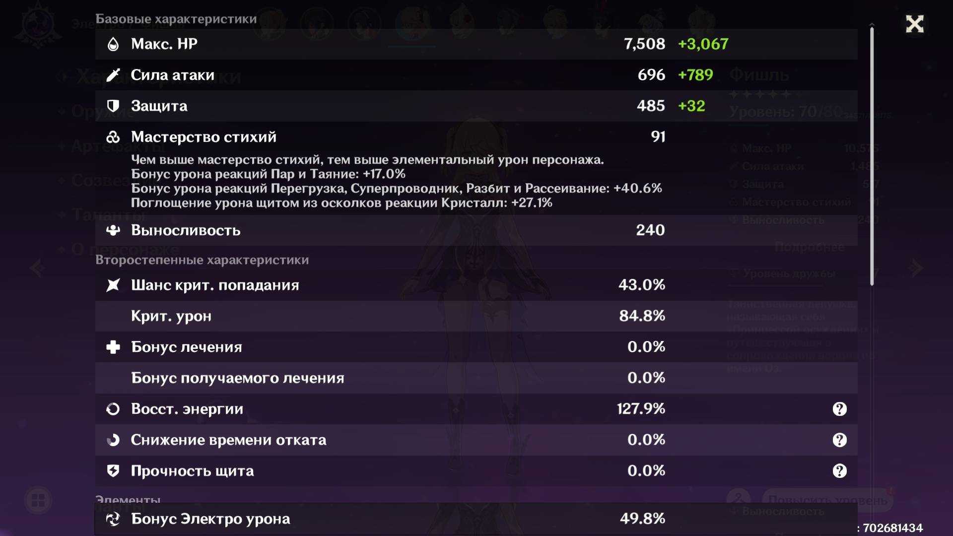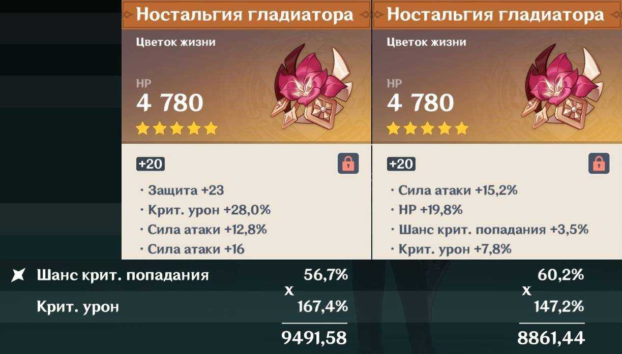 Однако при этом следует учитывать, что в Genshin Impact эти два показателя распределены неравномерно. Максимальное значение шанса крита в качестве основного показателя головного убора равно 31.1%, а крит. урона — 62.2%. По этой причине оптимальное соотношение шанс. крита : крит. урон = 1:2. Когда выбираете направление, куда развивать вашего персонажа, пользуйтесь этим соотношением. Когда же выбираете между двумя конкретными артефактами, пользуйтесь формулой выше (произведение шанса крита и крит урона).