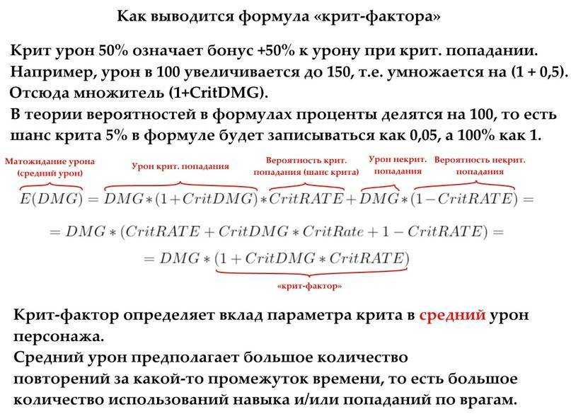Однако для того, чтобы понять, насколько наши показатели крита эффективны, необходимо учитывать и шанс крита. Для этого рассчитывают средний урон, который показывает, сколько в среднем наносит урона атака за большое количество применений.