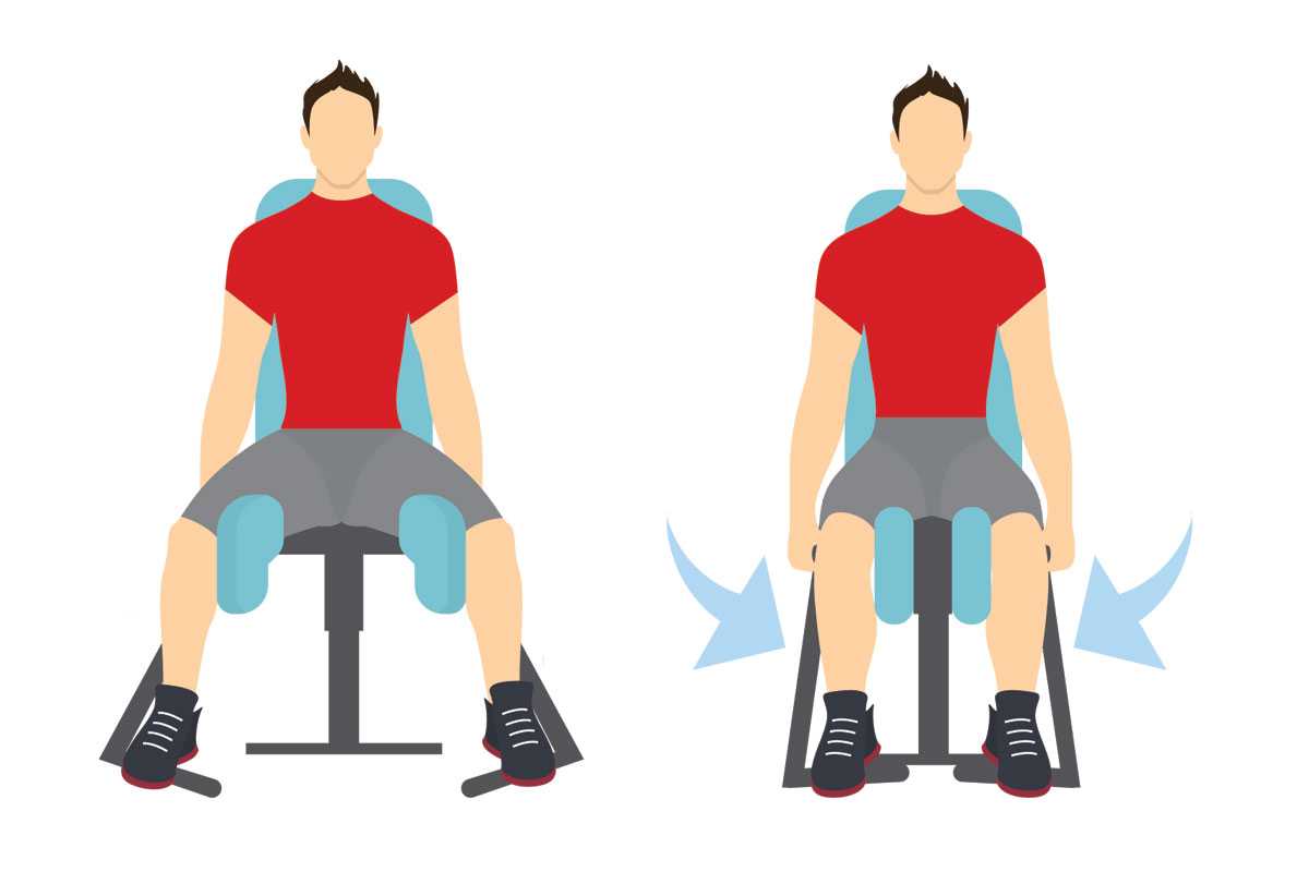 - Сведение ног сидя — 2-3 подхода по 10-12 повторений