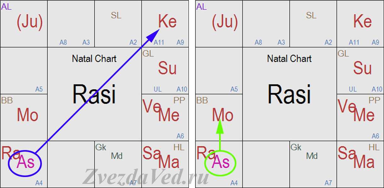 ► А теперь (в порядке эксперимента и для наглядности) представим, что в этой карте рождения лагна находится не в Стрельце, а в Близнецах (см. рисунок выше, синяя стрелка слева). Воспользуемся прежним алгоритмом.