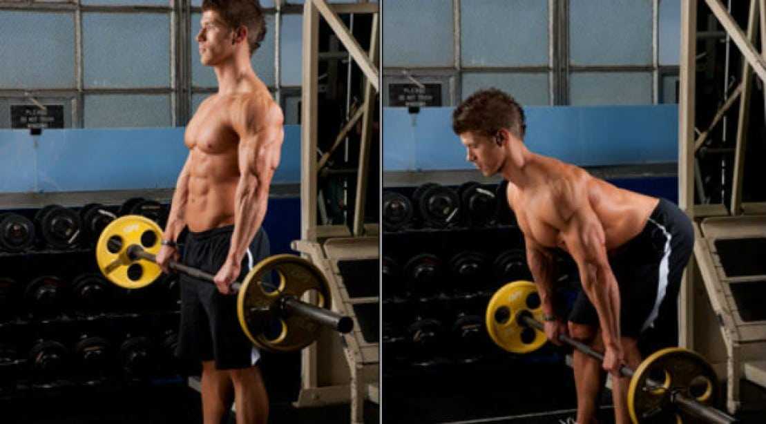 - на вдохе начинай наклоняться, отводя таз назад (гриф скользит по бедрам, ноги прямые или немного согнуты в коленях);