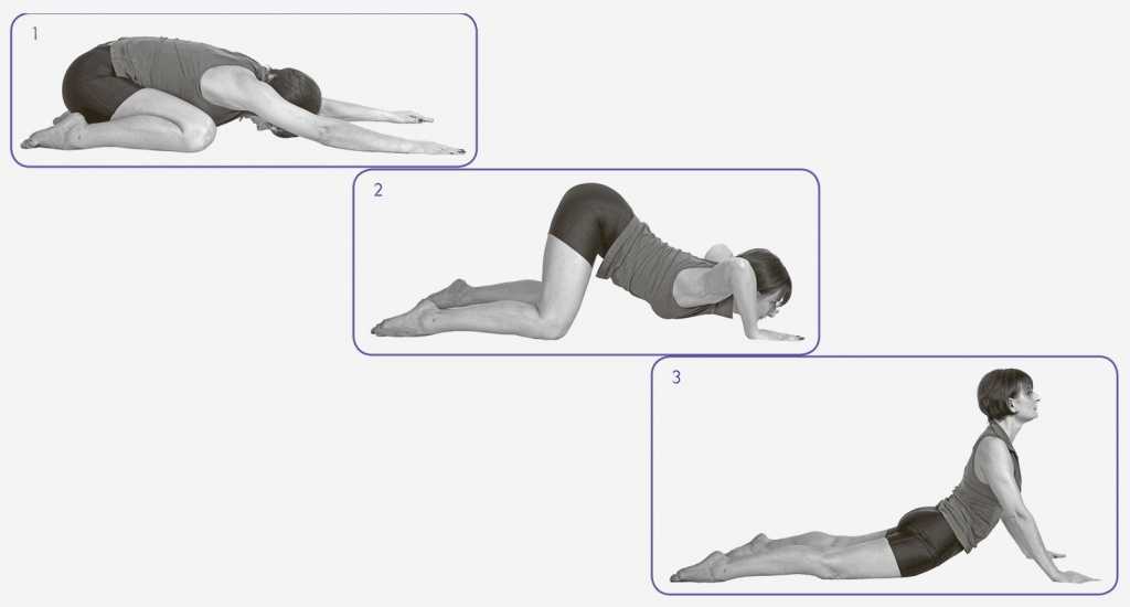 Один из вариантов – упражнение «Кошка». Прогибайтесь, как будто пытаетесь проползти под низким препятствием. Начинаем вперед, прогибаем грудной отдел, затем переносим тело немного вперед и прогибаемся уже в пояснице, поднимая грудь. Теперь то же самое – назад.